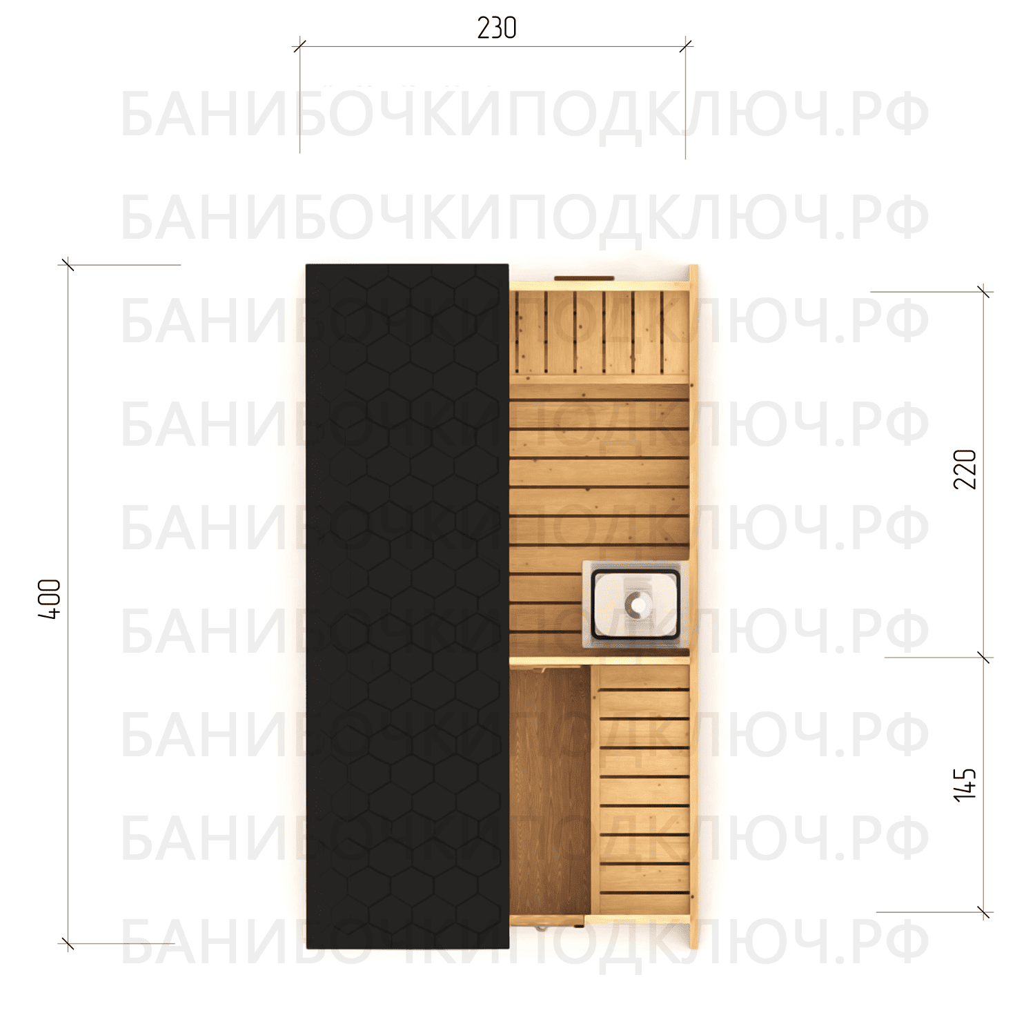 комната отдыха – 200х400, парная 250х220, мойка 150х220