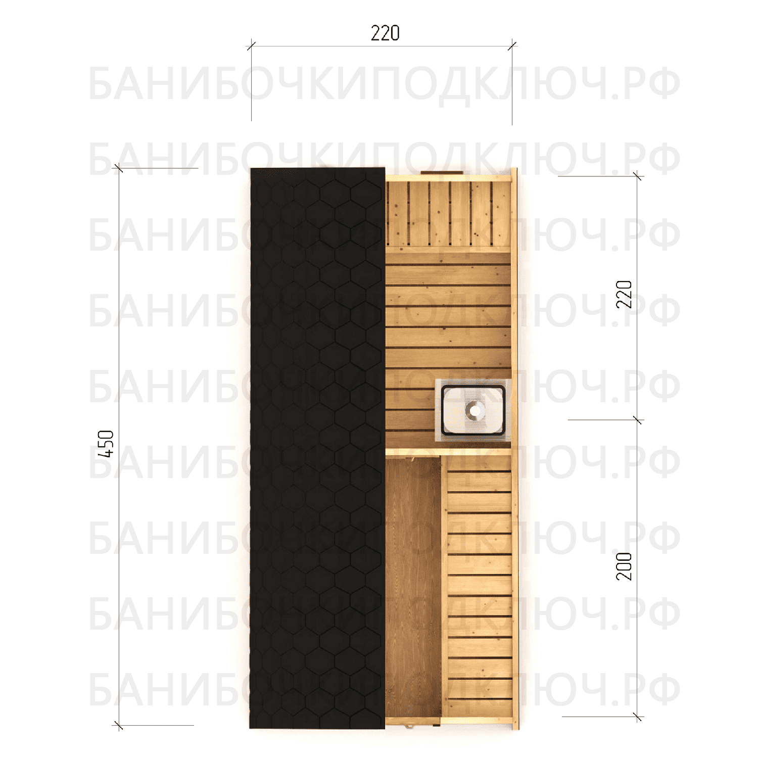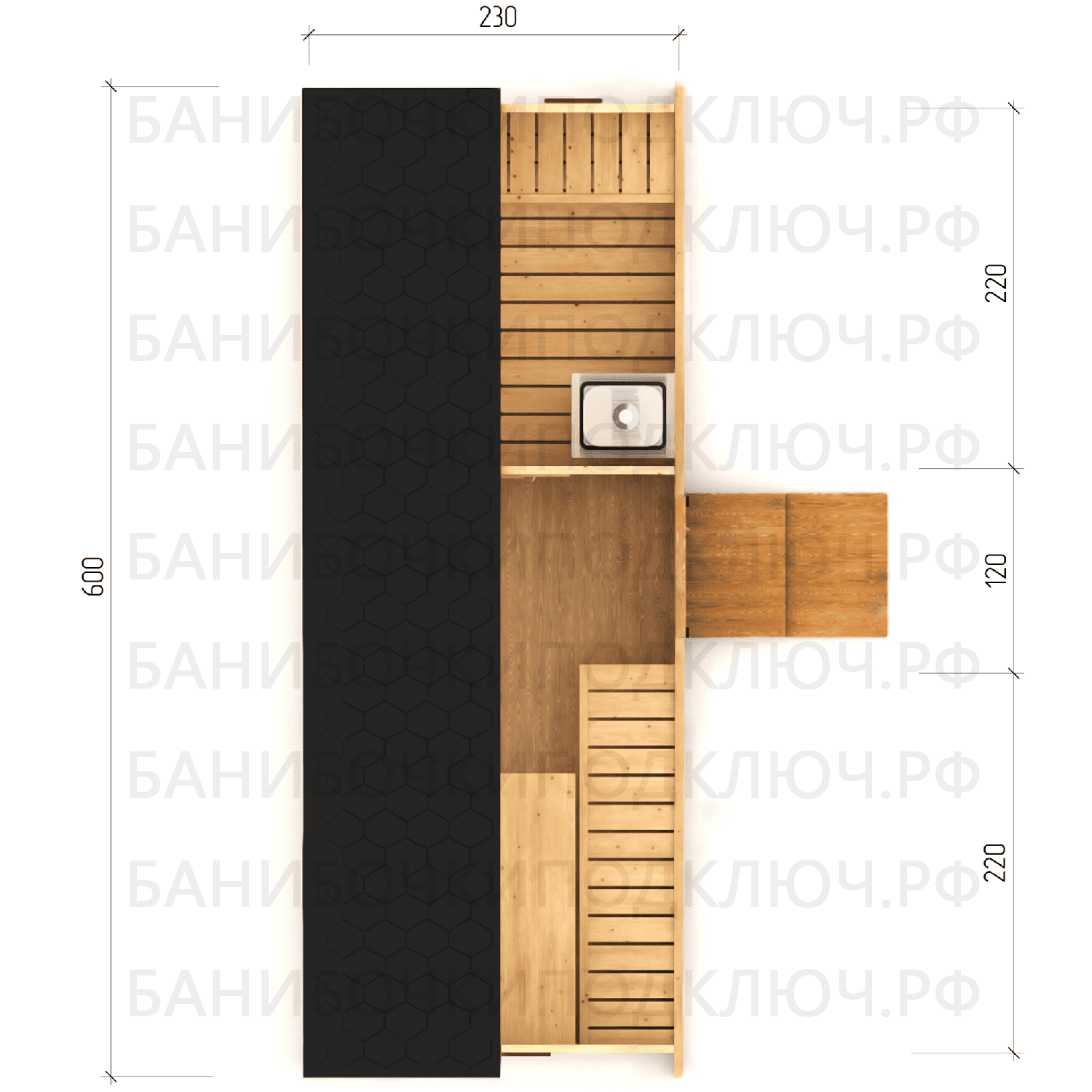 парилка - 220 см, мойка - 120 см, предбанник - 220 см